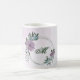 Caneca de café única com flores roxas e azuis empoeiradas românticas e folhas verdes.
