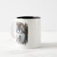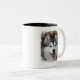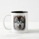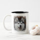 O cão de trenó do rouco Siberian fecha acima a caneca de café.