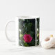 Uma caneca branca com painéis de rosas cor-de-rosa e a inscrição "Com amor". Lavadora de louça e micro-ondas seguras.
