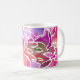 Uma bonito caneca branca com um design de cor-de-água de uma pintura original de flores de parede rosa púrpura.