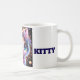 Um design de caneca de café branca e adorável, com um gato coroado de olhos azuis cintilantes. Os detalhes intrincados e as cores vibrantes criam uma atmosfera mágica e encantadora.