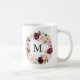 A caneca de café com monograma floral chico apresenta seu monograma/inicial personalizado cercado por uma coroa de rosas de aquarelas em tons de rosa-pincel, pêssego, roxo e burgundy com folhas verdes e exuberantes.