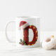 This letter 'D' is special because it combines rustic, warm wood texture with the cozy charm of traditional holiday decorations. The chunky red wooden letter, draped with glowing string lights, and topped with a Santa hat and holly creates a warm, inviting visual. It is perfect for holiday announcements, rustic farmhouse decor, or festive graphic design.
