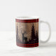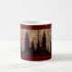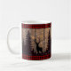 Rústica Cama de Veado de Woodland Com fundo de madeira rústica e padrão de xadrez de búfalo vermelho no topo e no fundo do vidro. Esta é a design de caneca perfeita para uma cena de inverno.