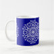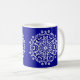 Esta mandala branca senta sobre um fundo azul brilhante e profundo. As cores são inteligentes e introspectivas. Parte da coleção Mola Mandala.
