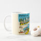 Um retrato alegre e colorido, cartão postal vintage para Savannah Beach, Georgia redirecionado para uma caneca.