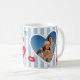 Whimsical and charming mug featuring scallop heart frame with photo. Watercolor cherries illustrations, cute hearts, lips and sparcles on striped background. Modern hand written script lettering "You and me", "Love". Red, pink, light blue and light yellow colors. You can customize card with your photo. Perfect for gift on Valentine's day.