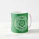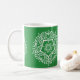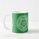 Esta mandala branca senta-se sobre um fundo verde. As cores são muito relaxantes e pacíficas. Parte da coleção Jarn Mandala.