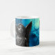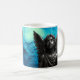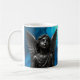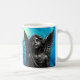 Um elegante anjo preto-metálico com asas refletoras e olhos azuis vívidos fica diante de um pano de fundo aqual, texturizado com gelo, criando contraste nítido e um humor legal e etéreo. Perfeito para fãs de arte fantásticas, amantes de decoração gótica, e espaços modernos buscando uma declaração impressionante sobre canecas, arte de parede e roupa.