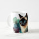 Faça uma declaração cativante com este espantoso retrato de aquarela de um gato siamês. Os seus olhares azuis impressionantes e as suas características elegantes são lindamente melhorados por salpicos profundos e ricos em tons de joias em turquesa, teal e tonalidades de ameixa. Um presente ou peça decorativa maravilhosa para entusiastas de gatos e amantes de arte que procuram adicionar sofisticação e vibração às suas casas.