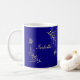 Caneca de café simples e única com flores douradas românticas e elegantes e borboletas em fundo azul real