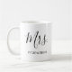Uma simples caneca de café com "Sra." em um roteiro elegante junto com seu sobrenome de preto sobre um fundo branco. Esta caneca de café moderna faz um presente de excelente para uma noiva.