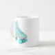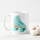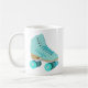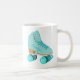 Mostre-lhes como você faz! Esta caneca de café personalizada apresenta um estilo realista de ilustração de um skate de rolo quádruplo clássico em teal. Ele está pronto para ser personalizado com um nome na coordenação das letras de script no lado do skate. Faz um presente de excelente para qualquer um que ama patinar em rolos ou é uma garota de derby de roleta. O gráfico e o nome aparecem em ambos os lados da caneca.