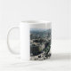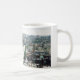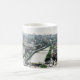 A caneca da Irlanda apresenta visão de linha do horizonte do centro da cidade de Dublin, ponte de O'Connell com tráfego de rua e rio Liffey
