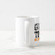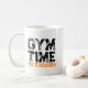Uma caneca com o slogan motivador "Gym Time No Excuses" em preto e laranja, em tons de cinza, tipografia.