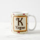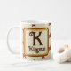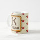 Este monograma de chá matinal ou caneca de café é uma forma excelente de adicionar um toque colorido à sua rotina matinal. Um padrão elegante de estrela rosa e vermelha aparece contra um fundo bege. A letra "K" aparece em um quadrado com o nome da família em ambos os lados desta caneca. A carta e o seu nome podem ser personalizados rápida e facilmente. Design original - C. McGouldrick