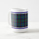 Uma caneca de café com tartan para Clan Stevenson e Stephenson. Padrão verde-claro, azul-real e xadrez escocesa negra de 1970, com sotaques amarelos e vermelhos.