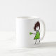 Uma bonitinha com uma caneca de café verde, cabelo e colar de pérolas num fundo branco. A citação é editável.