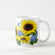 Lindos girassóis com pequenas borboletas azuis e flores de hydrangea azuis, tão alegres e aliciantes, façam uma caneca que iluminará o dia mais maçante!