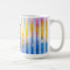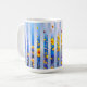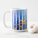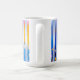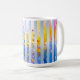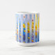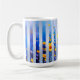 Abstract vertical blue stripes with sunrise gradients and gold accents on a white mug—ideal repeating fabric print or modern kitchen drinkware.