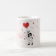 A charming and romantic ceramic mug featuring a joyful illustration of a couple sharing a playful piggyback ride. The man carries the woman while she holds a big red heart balloon, surrounded by delicate red confetti and hearts.