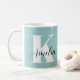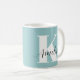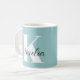 Uma caneca azul teal personalizada que apresenta seu monograma inicial em uma tipografia branca moderna e grande e seu nome em um script de assinatura de caligrafia na moda.
