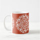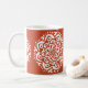 Esta mandala branca senta-se num fundo laranja escuro. As cores são criativas e quentes. Parte da Coleção Kylgh Mandala.