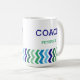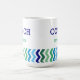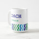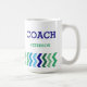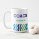 O teste padrão masculino personalizado de Chevron do treinador treina a caneca. Teste padrão de envoltórios da listra da viga em torno da base da caneca nos verdes e nos azuis. Personalize com nome na pia batismal verde debaixo da palavra TREINADOR no azul. Excelente para um treinador de algum esporte. A caneca personalizada na moda do treinador da escola faz um grande presente.