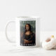 Mona Lisa Fibonacci Spiral Dourada Ratio Personalizado Coffee Mug. Escrevendo traseira: "A arte é de Deus em uma sequência simples" e escrevendo parte da sequência Fibre Channel: "0, 1, 1, 2, 3, 5, 8, 13, 21, 34, 55, 89, 144..."