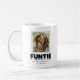 Tia moderna caneca de café com 2 fotos para você substituir por fotos de sua própria família, o título "funtie" em uma corajosa fonte preta/cinza, e o ditado "exatamente como uma tia normal, mas mais divertida."