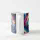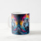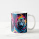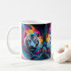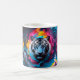 O tigre é representado principalmente em tons de azul, com padrões intrincados e elementos brilhantes enfeitando seu pelo, particularmente ao redor de seu rosto e corpo. O fundo apresenta um design simétrico e ornamentado com motivos celestes, incluindo luas em crescente, estrelas e padrões giratórios. O efeito geral é de beleza de outro mundo, misturando elementos da natureza e fantasia sem falhas. O olhar intenso do tigre e a postura regal contribuem para o sentido de poder e mistério emanando da trabalho de arte.