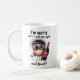 A foto é de uma caneca de café branca com uma coruja de desenho vestindo copos e vinho de bebendo com a mensagem "Desculpe, acidentalmente comi meus ovos." A caneca está sobre um fundo de cinza. A caneca está levemente inclinada para a direita. A coruja de desenhos está olhando para a esquerda, e sua expressão é de arrependimento. O vinho é tinto e o vinho é tinto. O texto está preto, e o fundo é um desfoque leve. A atmosfera é de humor e de alegria, apesar das desculpas. A imagem é provavelmente uma representação humorística de uma pessoa que cometeu um erro e está se desculpando.