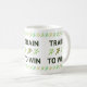Pictogramas de um corredor com a legenda "TRAIN TO WIN" fazem deste um design motivacional excelente para qualquer atleta entusiasmado. Os pictogramas são repetidos para formar uma borda em volta do topo e do fundo da caneca também. Essa versão é em cores verdes, para um tema no campo, e parece especialmente boa na caneca combo verde limão.