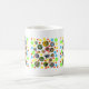 Caneca branca e clássica, com bolinhas coloridas e fotos de borboletas lindíssimas, entre elas o Velho Mundo (Papilio machaon), amarela, preta, azul e vermelha; borboleta monarca (Danaus plexippus), laranja e preta; borboleta-tigre azul-e-preto (gênero Tirumala limniace), borboleta-bukeye Junônia), castanha com manchas redondas coloridas; e borboleta fritilar, amarela com manchas pretas.