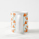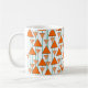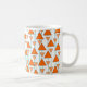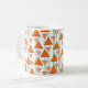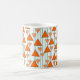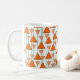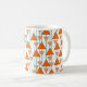 Esta caneca tem um design de deco de arte de triângulos pendurados em linhas de feltro em dois tons de laranja.