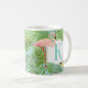 Design de caneca de café, feminicamente personalizada, apresenta um monograma personalizado inicial / letra emoldurado por um flamingo bonito, folhas tropicais de palma e flores de hibisco. As cores vibrantes incluem cor rosa, magenta, amarela, verde, marisco e azul aqua. Perfeito para decoração de verão ou decoração de férias de praia!
