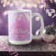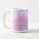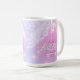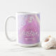 Desenho elegante de caneca de café de Despedida de Solteira disco personalizada em belas cores gradientes de lavanda a periwínkle e rosa com uma bola de discoteca funky, fonte retrô glamorosa e fundo de luzes de discoteca cintilantes. Este design sofisticado e elegante é facilmente adaptado para qualquer jantar especial e/ou evento de dança. Procure ID928 para ver outros produtos nesta coleção da moda.
