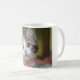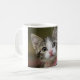 Uma caneca com um gatinho de mesa com olhos verdes, com um fundo embaçado Personalização a 100%. Clique no botão PERSONALIZAR para adicionar, mover, excluir, redimensionar ou alterar qualquer uma das fontes ou gráficos.