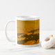 Uma renderização imaginária e original em 3d de uma paisagem na superfície de Titã, a maior lua de Saturno. Mostrando a atrativa paisagem âmbar e mares turvos de metano líquido. Possivelmente não é um destino de férias/feriado ideal, mas em termos de elogios ganharia qualquer coisa na Terra. O texto da caneca diz "Um presente de Titã"