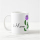Esta caneca possui um design limpo e elegante. A estrela desta design é este caule floral verde e folhas com uma delicada flor púrpura. Há uma fonte leve e clara que diz "Mãe". Você pode personalizar esta caneca com outro título ou nome.