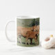 Uma caneca de café com uma foto de uma vaca marrom dourada de limousin com chifres, lambendo o é vitela, quando a vitela lamber seu próprio nariz.