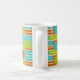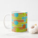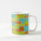 Esta caneca tem uma design moderna do século médio de retângulos repetidos em verde limão, cinamão castanho e turquesa com círculos em cima.
