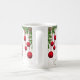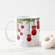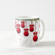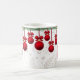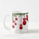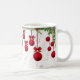 Enfeites de natal vermelhos, suspensos de um bando de arbustos de coníferas e bichos-da-rosa, sobrepostos a um fundo de desenhos de folhagem de cor clara, fazem uma linda Mug para as férias!