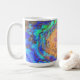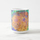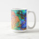 Esta caneca de abstrato apresenta um padrão mosaico brilhante que captura a coloração e o padrão únicos de uma concha de abalone polida. Os vibrantes azulejos cor de laranja, lacre e roxo dão a esta caneca um vidro manchado à medida que as cores espiralam ao redor do centro desta foto.