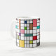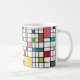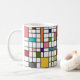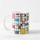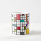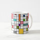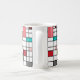 Esta caneca tem uma design moderna do século médio de uma grade de linhas pretas com quadrados e retângulos em cores retrorativas em um campo de branco.