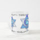 A pintura original do artista digital, Leslie Sigal Javorek, que aparece nesta caneca de vidro fosco é uma elegante representação do símbolo tradicional do judaísmo, uma estrela de 6 pontas comumente chamada "Magen David" (transliteração do hebraico, que é conhecida em inglês como "A Estrela de David"). A versão de Leslie aqui mostra 3 estrelas como feitas de vidro corado e com bordas tipográficas de cima e de baixo alternando as palavras "paz" e "Shalom".