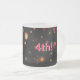 Fogos de artifício. Celebrar o Dia da Independência com esta caneca de 4 de julho. Fundo de fogos de artifício explosivos contra o céu negro. "4 de julho" está em vermelho com sombra azul.