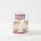Gêmeos, T-shirts de primeiro aniversário, fatos-chave, ímanes, cartas, posters, guardas e mais com um bebê e gêmeos em chapéus de festa e balões e texto com a seguinte redação: "Twins Primeiro Aniversário!".