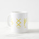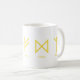 Uma caneca com os Viking Runes Jera (Year), Inguz (The God Ing), Fehu (Prosperity), Dagaz (Day) e Algiz (Protection). A design minimalista e geométrica é atraente. Os símbolos estão em amarelo sobre fundo branco. Cada glifo está imbuído de significado simbólico e gravatas na rica história da mitologia nórdica. Jera (Ano): ciclos das estações e natureza, colheita, esforço e colher recompensas e abundância. Inguz (The God Ing): semente, energia, fertilidade, criação, paz e harmonia. Fehu (Prosperidade): gado, gado, riqueza e abundância. Dagaz (Dia): luz que traz esperança, avanços, renovação, novos começos e iluminação. Algiz (Proteção): alce, mais alto, defesa, assistência e escudo para evitar energia negativa.