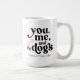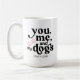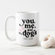 Um presente de casal bonito para mães e pais de cachorro. A cor das palavras "Você, eu e os cães", assim como a cor das patas, podem ser alteradas entrando na opção Editar por Ferramenta de Design, ao personalizar. As cores podem ser alteradas para cores diferentes em cada lado da caneca. Você pode fazer dele um presente de casal e ter um esquema de cores diferente para cada pessoa.